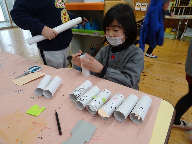 生活発表会後も、好きな遊びに4歳児さんに衣装を着せてあげたり、登場人物の人形を作って遊んだりして楽しんでいます。お話に使えそうな小道具もまだまだ制作中です。役を替わりあったり、「これ使ったらもっとよくなるかも?」と自分たちで考えた小道具を使ったりして劇遊びを楽しむ姿が続いています。子どもたちにとって、今回の劇遊びがとても楽しい経験となったようです。