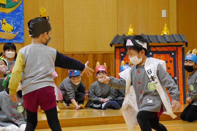 みんなで考えた話をペープサートを使って共通理解したり、鬼会議で桃太郎と何で勝負するかを意見を出し合って相談したりしています。鬼との対決は毎回勝敗が変わるので大盛り上がりでした。本番もみんなで力を合わせて息ぴったりでがんばりました!!