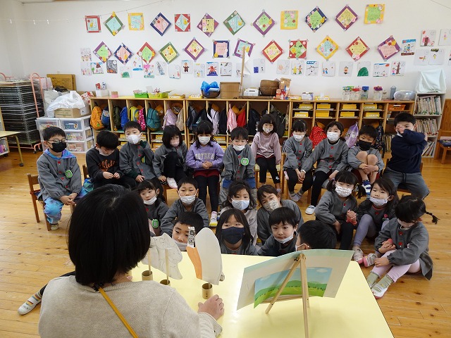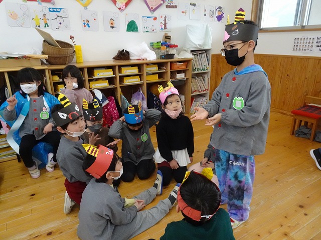 3学期になり、各クラスで劇遊びを楽しみました。友だちと一緒にお話の世界にイメージを膨らませながら遊びを進めていく中で、役になりきって表現したり、友だちと相談しながら工夫して劇遊びを楽しんだりする姿が見られていました。