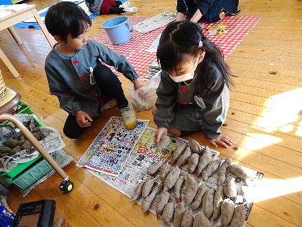 11月8日(水)にひまわり、すずらん、こすもす組、17日(金)にあじさい組がさつまいもクッキングを行いました。子ども達と芋ほりをしてから何を作ろうかと相談し、さつまいもクッキー(ひまわり組、こすもす組)、焼き芋(すずらん組)、大学芋(あじさい組)を作ることとなりました。クッキングの当日の子ども達はやる気満々!みんなで作り方を確認し、お芋をつぶしたり、型取ったり、焼いたり、また焼き芋の準備をしたり・・・と一つひとつ楽しんで取り組みました。