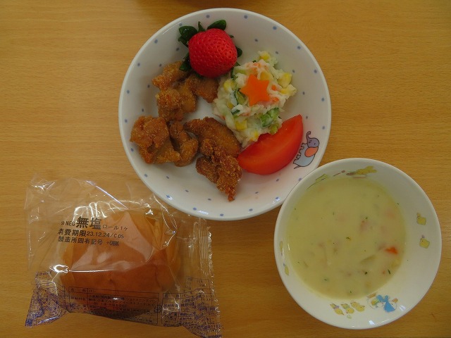 0~3歳児のクラスでは、ツリーのようなポテトサラダにフライドチキンといったクリスマスならではのメニューを、クラスのみんなと美味しくいただきました♪
