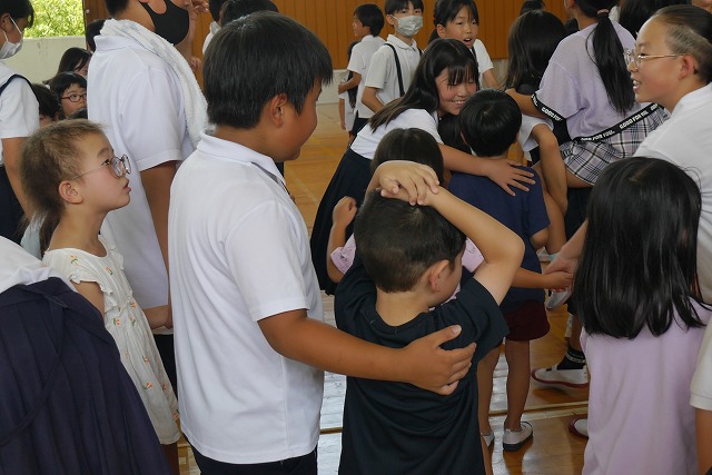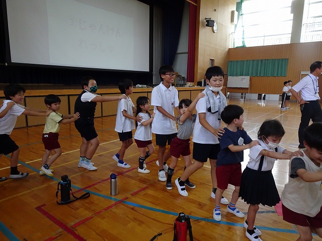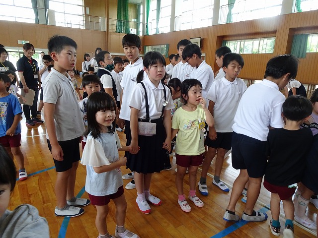 また今週8日(月)には、味間小学校5年生との交流をしました。バスで味間小学校に到着すると体育館に迎え入れてもらいました。広い広い体育館に、自分達よりうんと年上のお兄さん・お姉さんがたくさんいて、最初は緊張気味の子どもたちでしたが、地区が一緒のお兄さん・お姉さんが優しく迎えに来てくれて、少しずつ表情が和らいでいった子どもたちです。お兄さん・お姉さんが一緒にしようと考えてくれていた遊び「ジャンケン列車」では、どんどんつながって長くなっていく列車に笑顔がどんどん増えていきました。