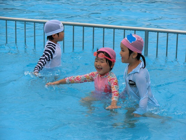 7月10日(水)、味間小学校のプールで遊ばせてもらいました。今回は6月25日(火)に続いて2度目の味間小学校でのプール遊びでした。前回は“地獄シャワー”と呼ばれる、とっても勢いの強いシャワーにドキドキの子どもたちでしたが、「前、大丈夫やったしな!」「こわくない、こわくない!!」と今回は強気な子どもたちでした。大きなプールで、開放感をたっぷりと味わいながら、思い切り楽しんでいました♪