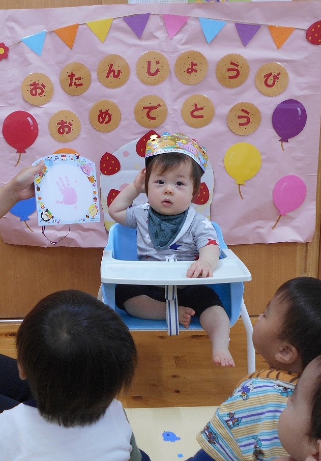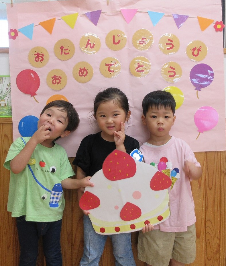 7月12日(金)に7月生まれのお友達の誕生会をしました。(4,5歳児は夏季休業・夏季保育に入りますので、8月生まれのお友達の誕生会もしました。)