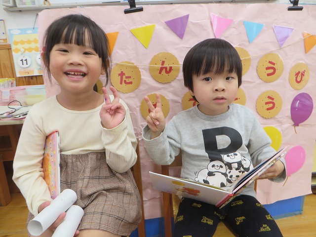 4.5歳児クラスでは照れくさそうな表情や嬉しそうな表情で、友達から「好きな食べ物はなんですか?」や「大きくなったら何になりたいですか?」等のインタビューに答えたり、プレゼントをもらったりし、また1つお兄さんお姉さんになったことを喜んでいました♪