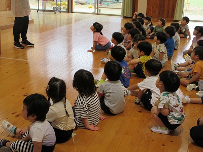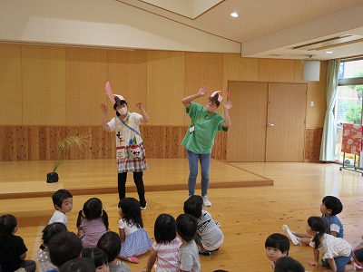 今日は9月生まれの誕生会をしました。2歳児2クラス合同で誕生児のお祝いをした後、十五夜のようなお月様と可愛いウサギさんが出てきて、楽しいお話がありました。