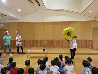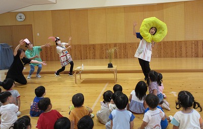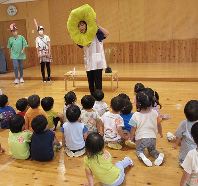 見えない箱の中身(園児には見えて、探っている保育者には見えない)を言い当てるゲームもあり園児たちは大喜びで見入っていました。