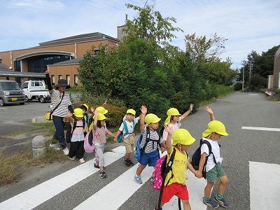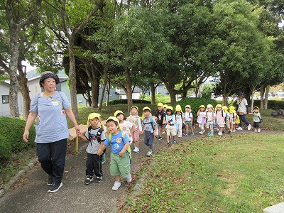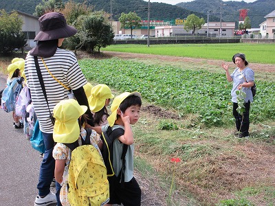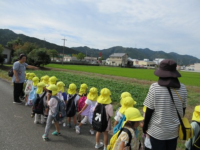 9日に行うサツマイモ掘りを楽しみに、「大きなお芋が掘れるといいね♡」などと話しながら楽しく畑まで向かいました。