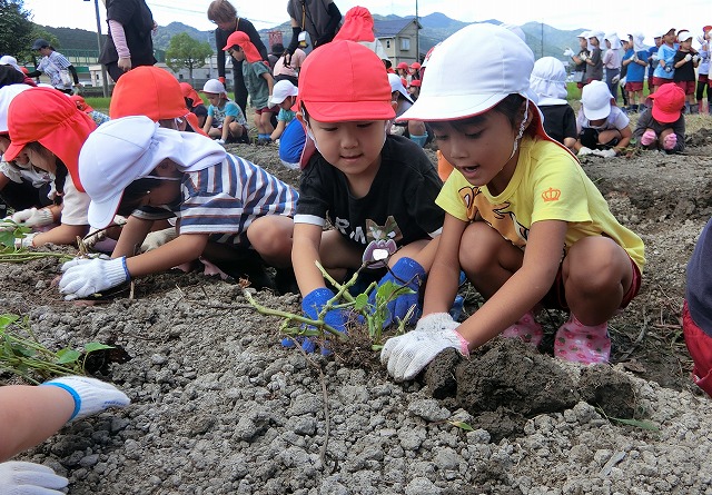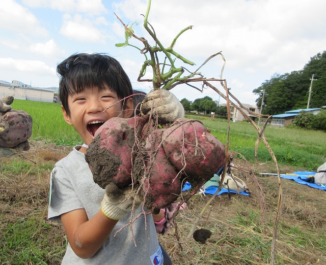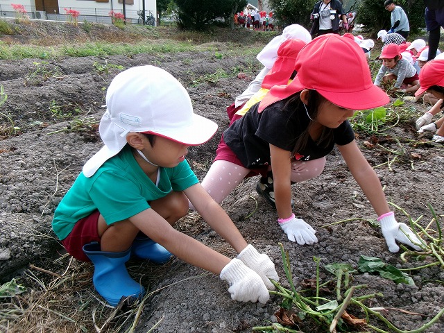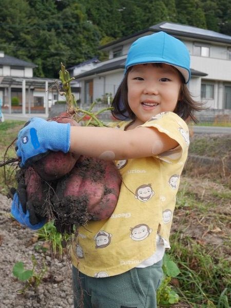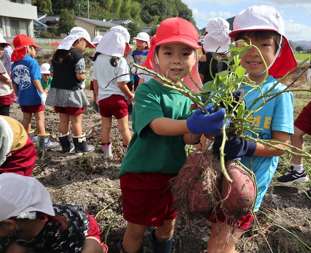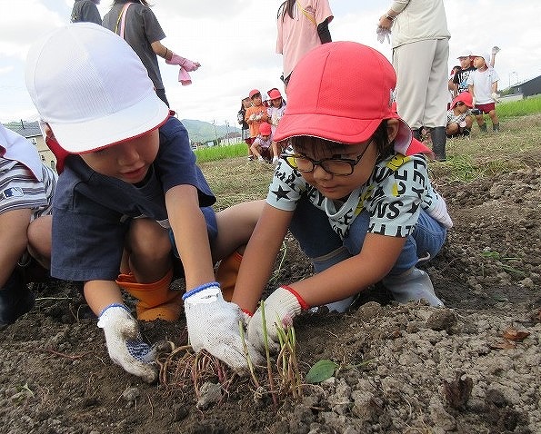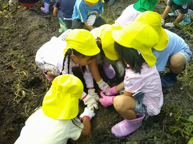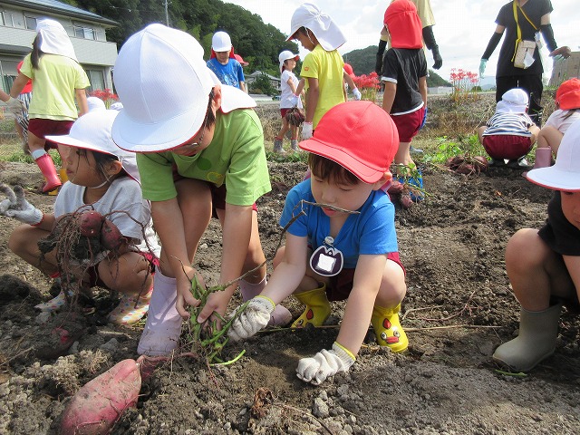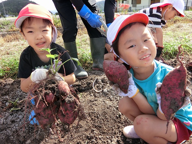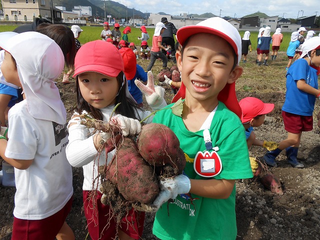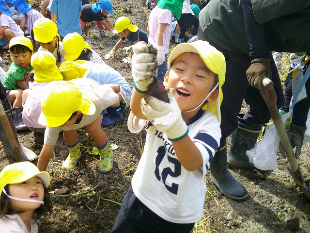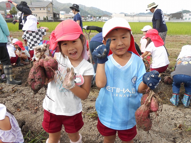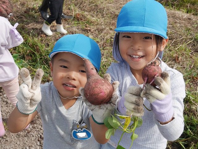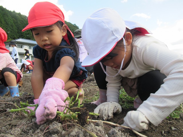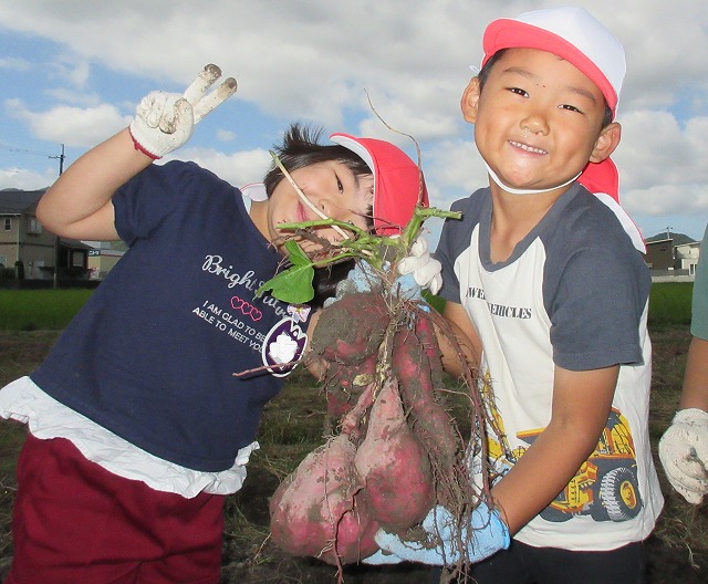 10月9日(木)に3歳児から5歳児のみんなでサツマイモ掘りをしました。4,5歳児はなかよしペアで、3歳児は友達と一緒に力を合わせて掘りました。切ってもらったツルのまわりを掘っていると大きなおイモが顔を出し「おイモあった!!」「めっちゃ大きい!!ここ一緒に掘って~!!」と大喜び!すごい勢いで土を掘り、大きなおイモを抱えて満足そうでした💛