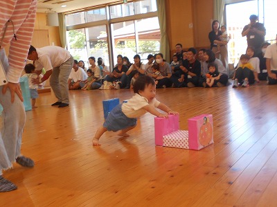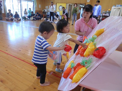 0・1歳児は遊戯室にて、親子の触れ合いを楽しみながらサンサン体操をしたり、普段から各クラスで楽しんでいる遊びを親子でしたりしました。