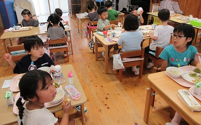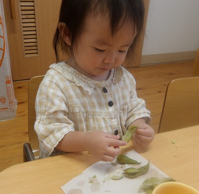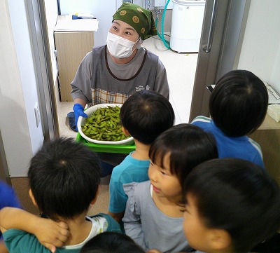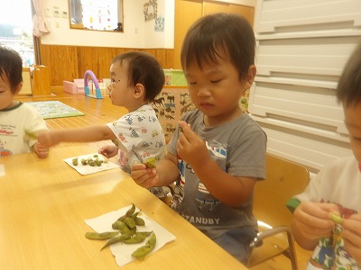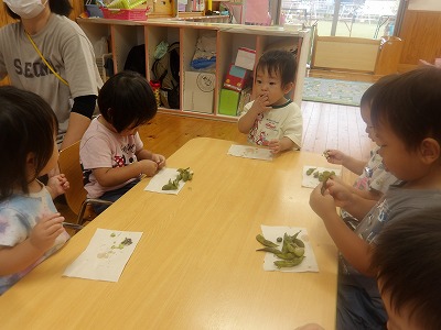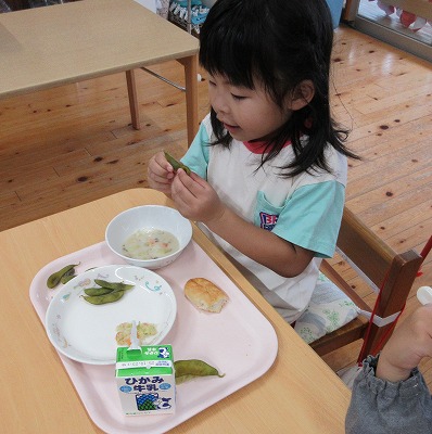 もぎ取った黒枝豆を給食室へ持って行き、「湯がいてください」とお願いし、4・5歳児は給食の時間に、0~3歳児は午後のおやつの時間にいただきました。