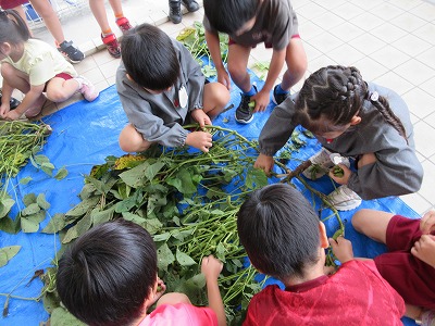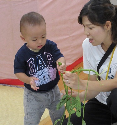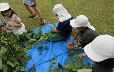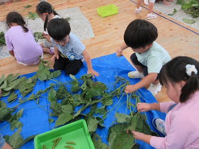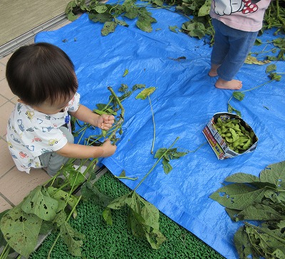 10月16日(木)丹波篠山の特産物で、園児達にも馴染み深い“黒枝豆”をもぐ体験をしました。サヤを持って枝からもぎ取る作業は、慣れた手つきという園児もあり、さすが『丹波篠山っ子』と感じる場面もありました。もちろん初めて経験する園児もいましたが、友達と話をしながら楽しく活動していました。