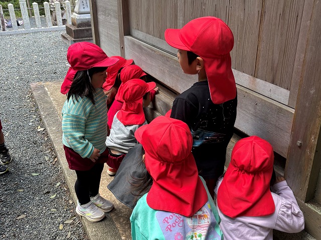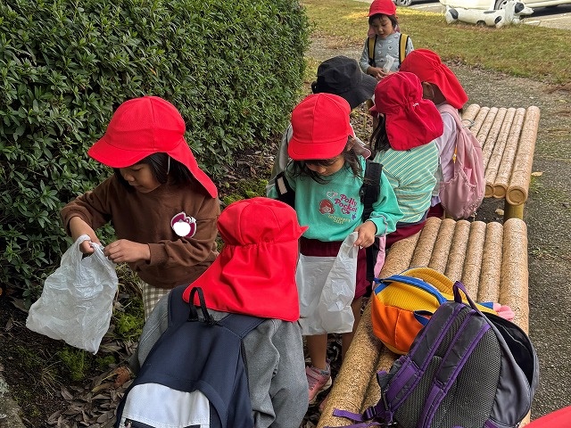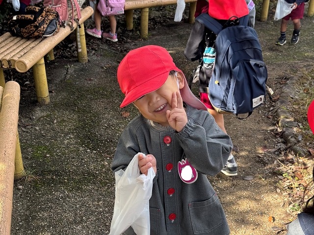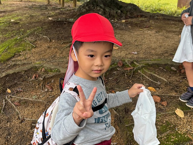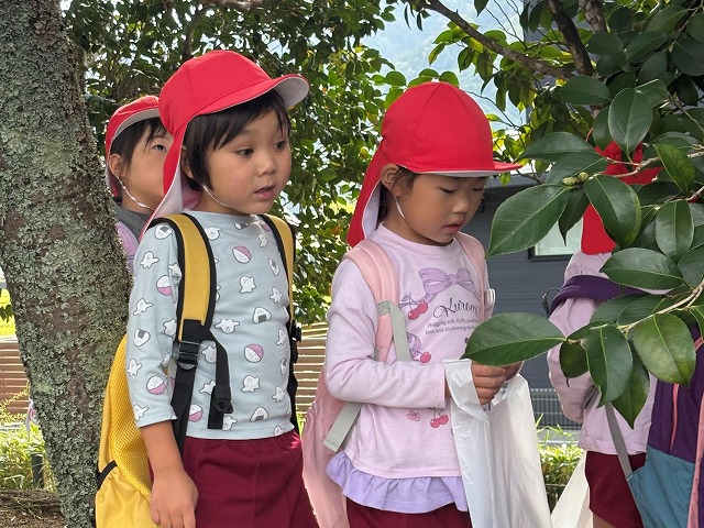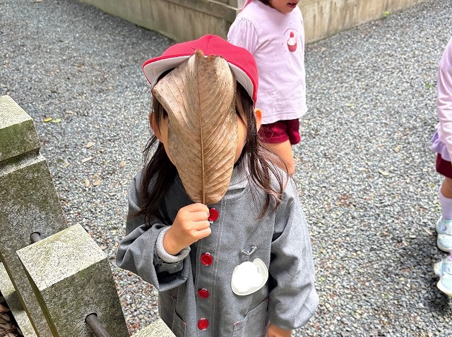 四季の森公園を通って八柱神社にお散歩に出かけました。公園や歩道にどんぐりが落ちていて、「いっぱい落ちてる!」「赤ちゃんどんぐり見つけたよ!」と大喜びの子ども達でした♪八柱神社では大きな葉っぱを拾って「先生見て~!」と顔を隠したり、神社の隙間を覗き込んで「トトロいないかな~」「トトロが通れそうなところあったよ!」とトトロ探したりして楽しみました。そして、黄色や赤色の葉っぱ、栗、色づき始めた紅葉など、たくさんの秋を見つけることができました。自然にたくさん触れて遊びたいと思います!