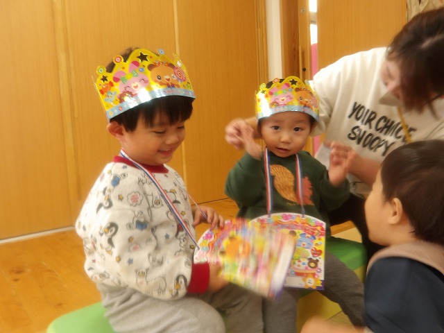 0歳児11月21日に11月生まれのお友達の誕生会をしました。歌をうたってもらったり、「おめでとう!」と祝ってもらったりと、特別な一日になったように思います。皆の前で、名前を言ったり、インタビューに答えたり照れる姿もありましたが、恥ずかしいながらも嬉しそうに答えていました。嬉しそうな顔がたくさん見られましたよ。