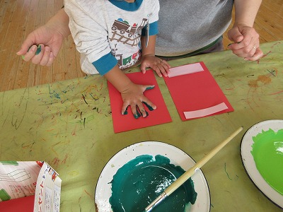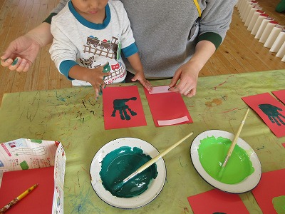 別の保育室では、『親子クリスマス会』のプログラム作りに取り組んでいました。絵具を手の平に塗ってくすぐったかったり、少しひんやりしたりする感触を味わいながら、慎重に手形を押していました。どんなプログラムが出来上がるのか楽しみです♪