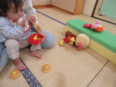 引き続きお弁当ごっこを楽しんでいる園児達・・・💗先生の膝の上で、デザートを食べたり、お気に入りのお弁当箱を持って喜んだりしています。