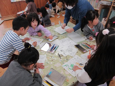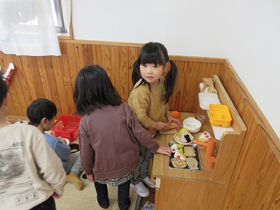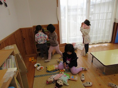 保育室では、4歳児のお姉さん・お兄さんにいろいろな遊びに誘ってもらい、自分の好きな遊びを決めて楽しんでいました。塗り絵とままごと遊びが人気のようでした♪