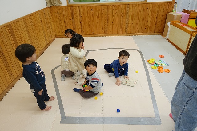 保育教諭等と一緒に「いーれーて!」「いーいーよ!」と言って大きな手袋に入って遊びました♪「いーいーよ!」と大きな声で言う姿や、「いいよ」と言ってもらってニコニコしながら手袋の中で遊び始める姿から、友達とのやり取りの楽しさが感じられました!