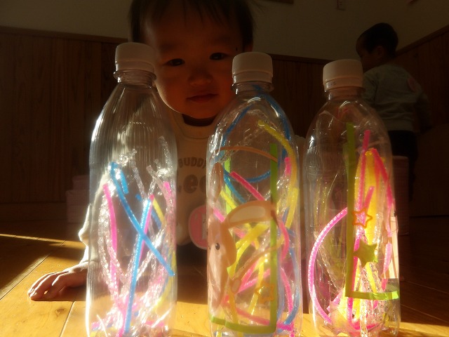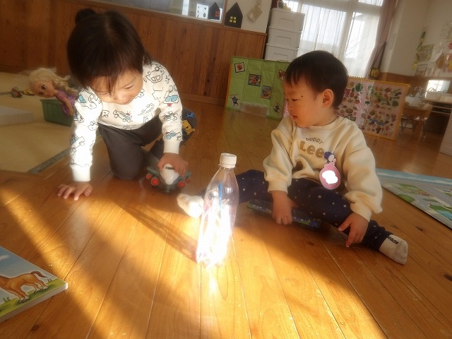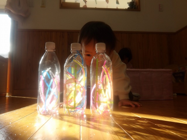 この日は、ポットン落としで遊んでいましたよ。すると、一つの容器をこの光のところに置く姿が見られました。