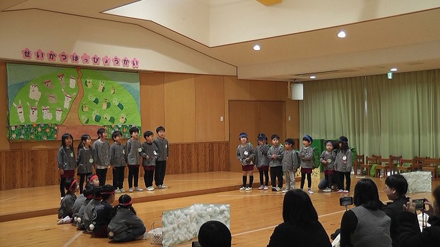 各クラスでお話のストーリーを考えたり、お話の言葉遊びを楽しんだりしました。また、劇遊びに必要な物を考えて作ったり、友達と意見を出し合ったりしてイメージを膨らませて劇遊びを楽しんできました。お家の方に見守られる中でのびのびと自分のもっている力を発揮し、クラスの友達と気持ちを合わせて発表しました。みんなの取り組みが本当に素晴らしかったです!