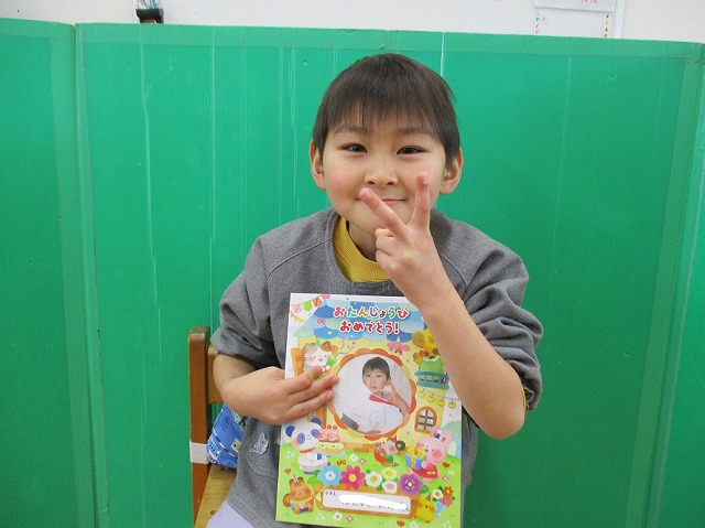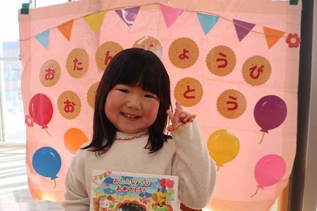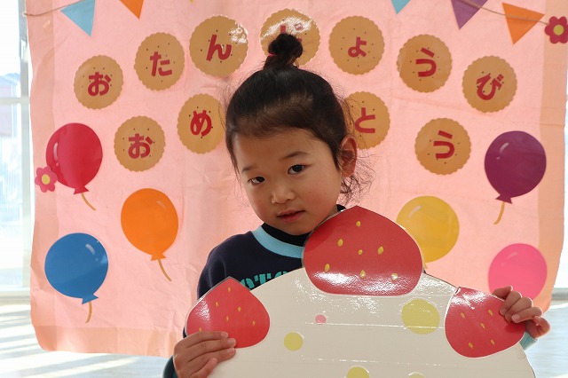 お友達から、「おめでとう!」と、声を掛けてもらうと、ちょっぴり照れながら、「ありがとう」と答えていました。その後、「好きな食べ物はなんですか?」「大きくなったら何になりたいですか?」と質問されて、「いちごが好き」「チョコレートが好き」と答えたり、「大きくなったら警察官になりたい」「アイスクリーム屋さんになりたい」と将来の夢を答えたりして楽しい時間を過ごしました。