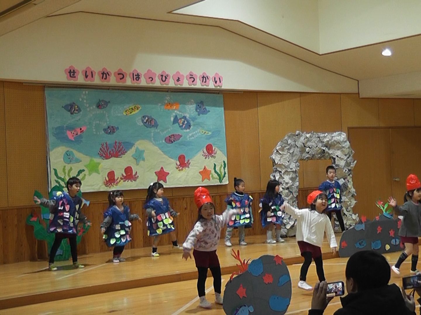 当日は、「緊張する」「ドキドキする」と言う姿もありましたが、保護者の方に見ていただくことに嬉しさを感じ、大きな声で台詞を言ったり、役になりきったりすることができました。終わったあとは、「楽しかった!」「見てもらえて嬉しかった!」「またやりたい!」と満足気な子ども達でした。また、舞台でいきいきと発表する姿に成長をを感じることができました。