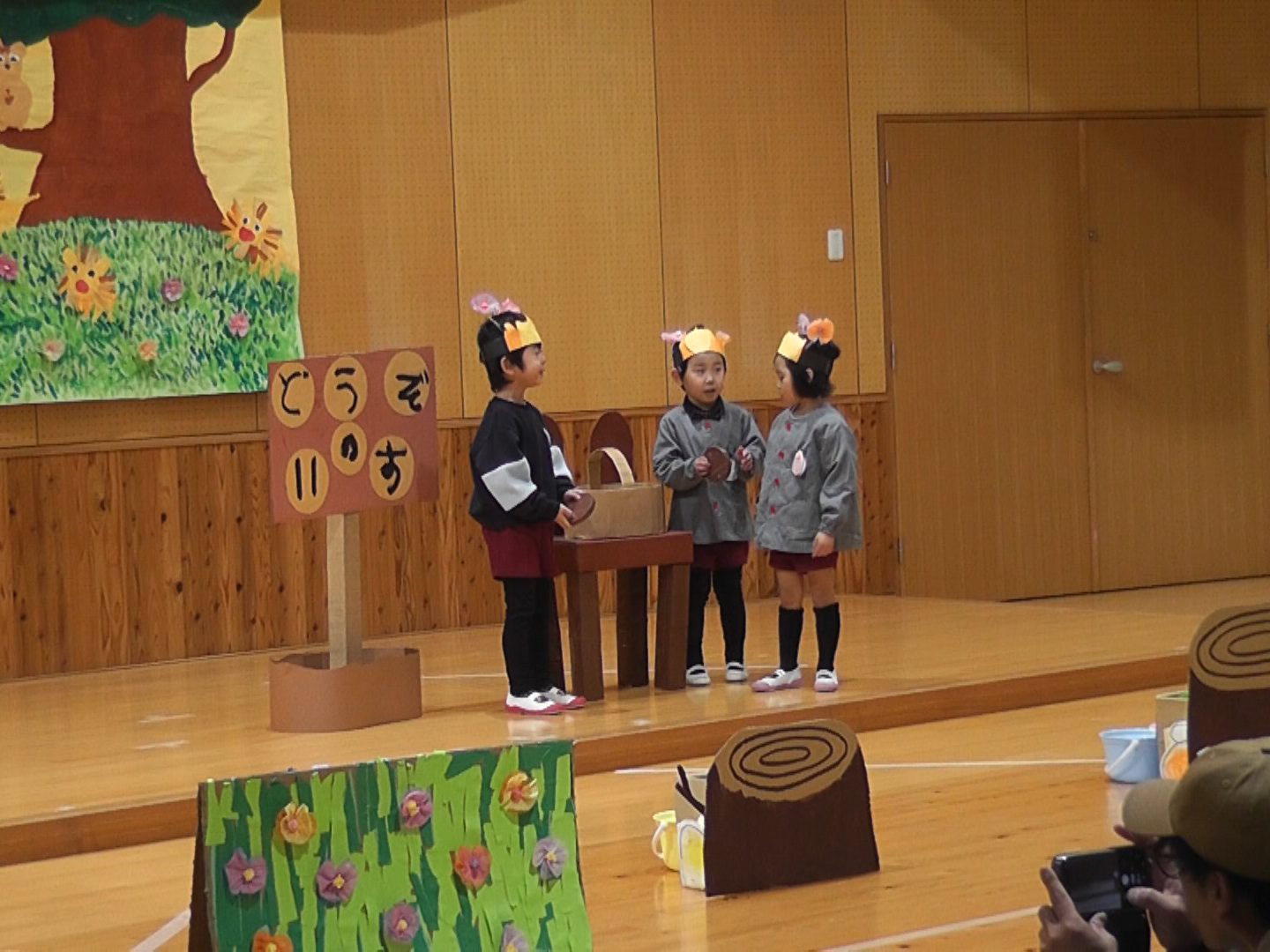 れんげ組は「にじいろのさかな」、あやめ組は「10ぴきのかえる」、すみれ組は「ゆうびんうさぎとおおかみがぶり」、さくら組は「どうぞのいす」のお話で劇遊びをしました。