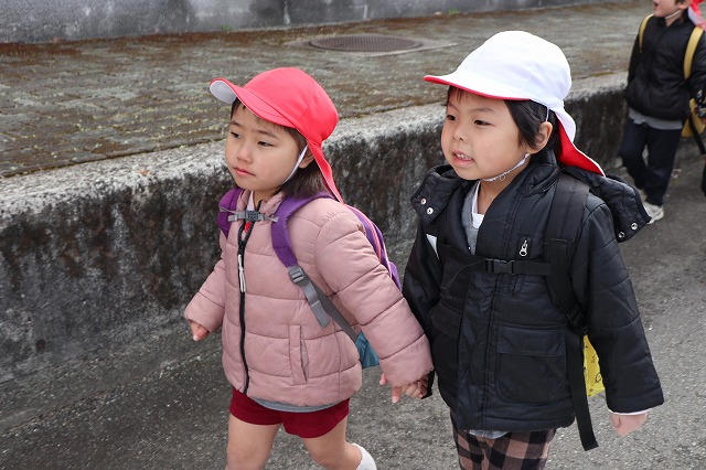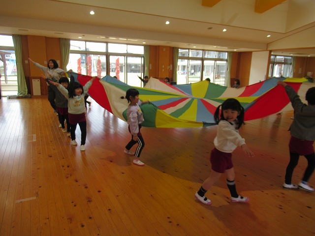 散歩に出かけたクラスでは、年長児が自然と道路側や溝側に歩いてくれ、年中児を気遣う姿が見られたり、優しく話しかけてくれたりする姿が見られました。何気ない会話でもとても楽しそうな表情が見られ、安心できる存在なのだと感じました。公園に着くと身体を動かして遊んだり、自然物を見つけたりして春の訪れを感じていました。図書館に行ったクラスでは、ルールを教えてくれたり、絵本を読み聞かせしてくれたり年中児を思いやる行動がたくさん見られました。また、年長児が運動会でしていたバルーンに憧れを抱き、教えてもらいながら一緒に楽しむクラスもありました。