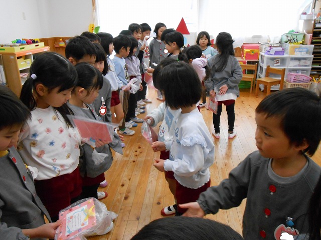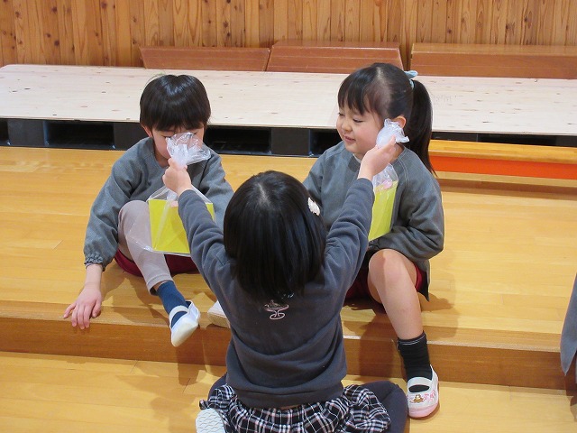 一年間の感謝の気持ちを込めて作ったプレゼントを渡すと、なんと年長児からもプレゼントがありました!お互いにプレゼントがあったことに驚きつつも、とても嬉しそうでした。給食も一緒に食べて、なかよしペアで過ごす一日を楽しんでいました!