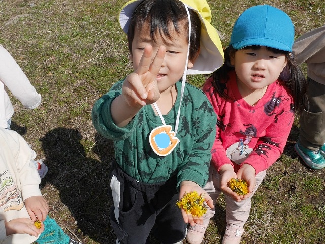 原っぱに着くと、かわいいオオイヌノフグリを見つけたり、タンポポを見つけて喜んで摘む姿があったり、広い場所で思い切り走り回ったりすることを楽しんでいました。原っぱの端っこの方から「みつけた!」と大きな声がしたので見に行くと、小さなつくしが生えていました。「もう春だね~」と春を見つけて嬉しそうな子ども達でした☆