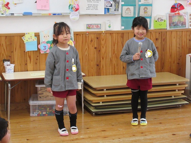 2月17日 2月生まれのお誕生会をしました。1つ大きくなり、嬉しい笑顔がはじけています。お友達から、「おめでとう!」と、声を掛けてもらうと、ちょっぴり照れながら、「ありがとう」と答えていました。その後、「好きな食べ物はなんですか?」「大きく...
