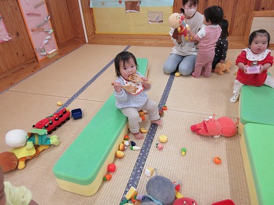 秋の遠足におうちの方に作ってもらったお弁当を持って行った楽しかった経験から、お部屋で“お弁当ごっこ”をして遊んでいます。シール容器におもちゃの食べ物を入れてお弁当を作っています。中にはロッカーを電子レンジに見立てて温めている園児もいて、...