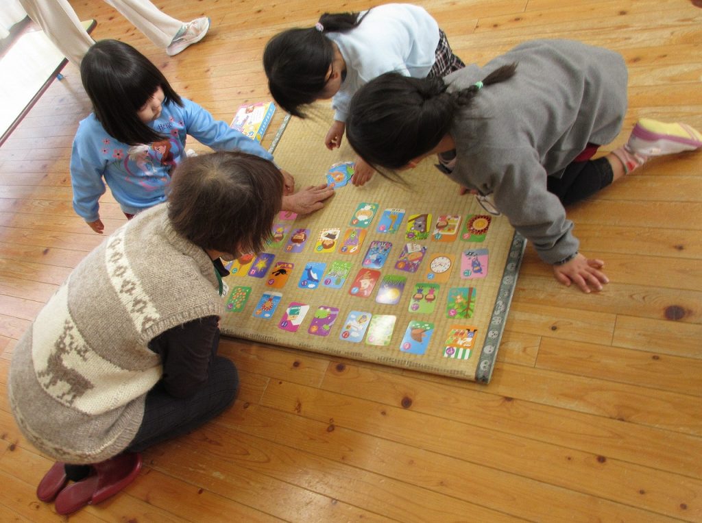 今日は、福寿会の方との交流会でした。遊戯室で“コマ回し名人”さんと“羽子板名人”さんの技を見せていただいた後、各クラスに分かれてそれぞれ昔遊びを一緒にしたり、教えてもらったりしました。読み札を読んでもらって一緒にカルタとりをしたり、あやとり...